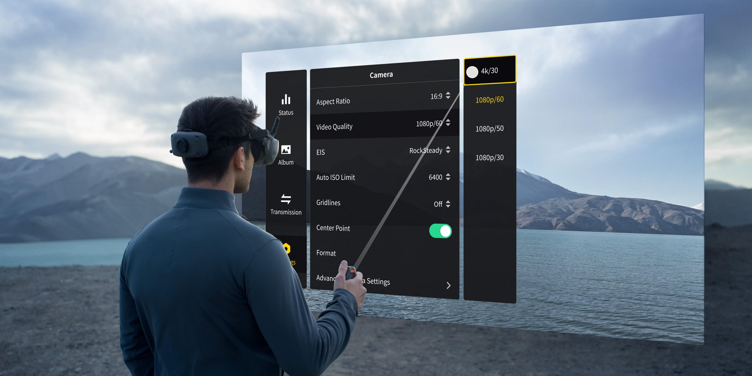 機体が離陸する前だけでなく、ブレーキが作動されている時やホバリング中に、ゴーグル内部の各カメラの設定の調整を行えます。
