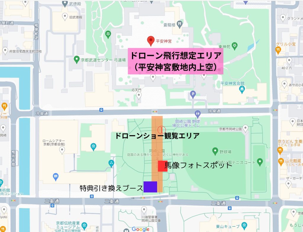 ドローンショー閲覧場所は岡崎公園ですが、実際にドローンが飛ぶのは平安神宮からです!